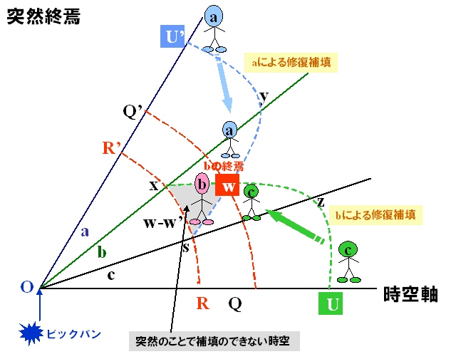 2 自然界に与える影響 (1) 自然終焉図(天寿を全うした場合) 自然終焉図(天寿を全うした場合)は、a、b、cの三人は時空軸が平行している隣り合った人で、 どこに住んでいる人かは分かりません。 ![]() Oはビッグバン、宇宙(因果関係)の始まりです。 PP’はa b cの時空線 ここでxsはbが天寿を全うする前兆の始まりで、wの点で亡くなったとします。 QQ’はその点での時空線 ここから後はbは存在しませんが 兆候のあったと時点のxsから 自然はa、c二人にbのwを予測して影響(補充)力を与え始め、QQ’からUU’のyzを目指して 修復補填始まり、自然界には悪い要員は残さないような働きが進みます。 |